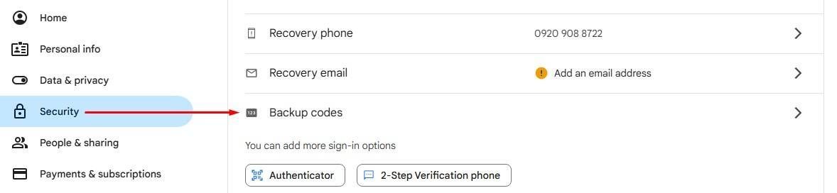 3. Once you 2-Ste[ Verification is done, go back to Security & click Backup Codes and generate the 10 backup codes.