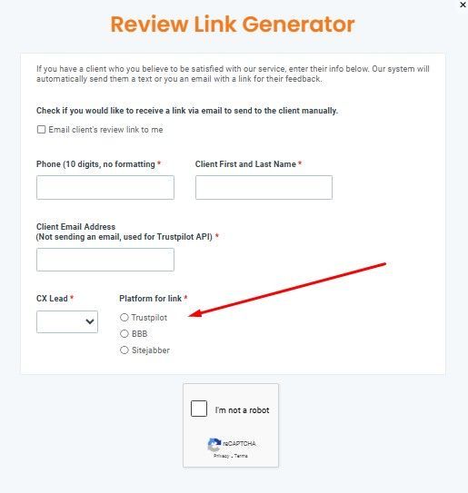 The Trustpilot button in your Dashboards have been change to "Review". This leads to the same Review Link Generator Form but this now has an additional option to select which particular review you'd like to send,