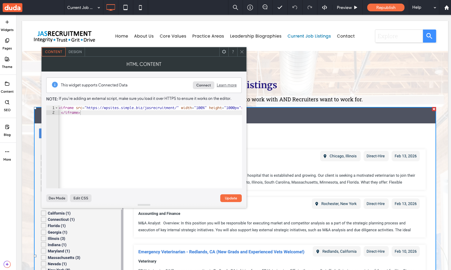 Project Background: The client required a digital solution for a recruitment company to manage job listings with a secure database and dedicated logins for employers and applicants. To ensure resumes could be read effectively by applicant tracking systems (ATS), we integrated an ATS-compliant third-party platform. The solution was hosted on WordPress to enable seamless embedding within the client’s Duda site. The final result delivers a streamlined, user-friendly experience for both employers and applicants, combining accessibility, compliance, and technical flexibility in a single, elegant solution.